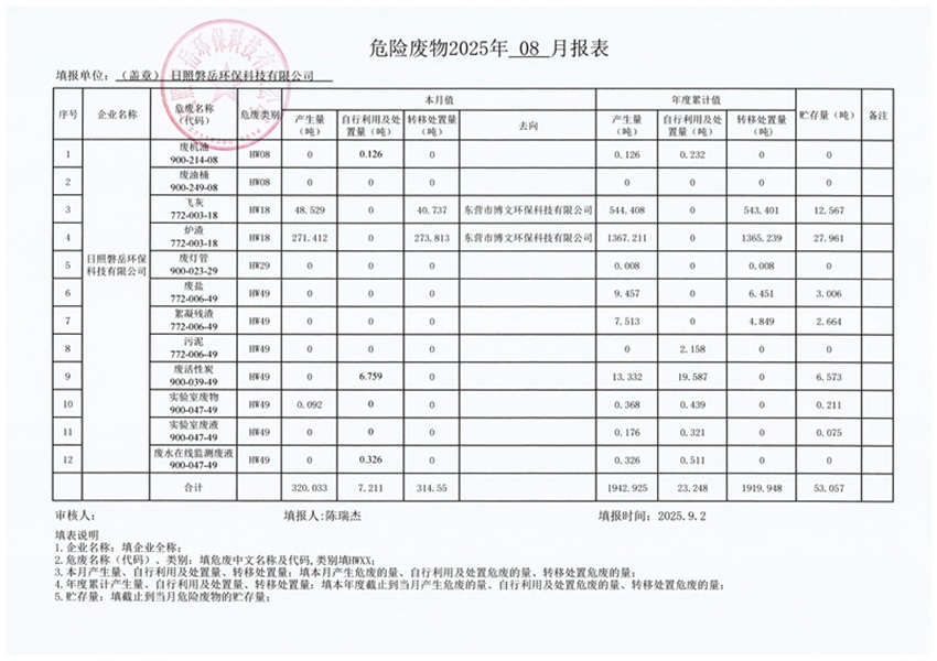 日照磐岳环保科技有限公司危废经营单位2025年7月份报表