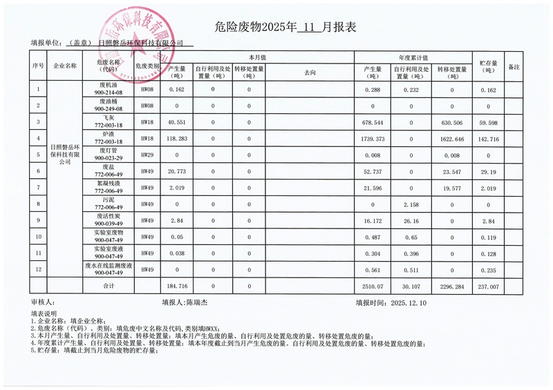 日照磐岳环保科技有限公司危险废物产生2025年11月份报表