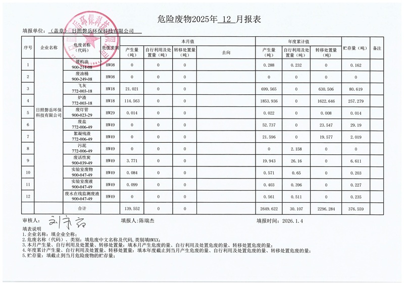 日照磐岳环保科技有限公司危险废物产生2025年12月份报表